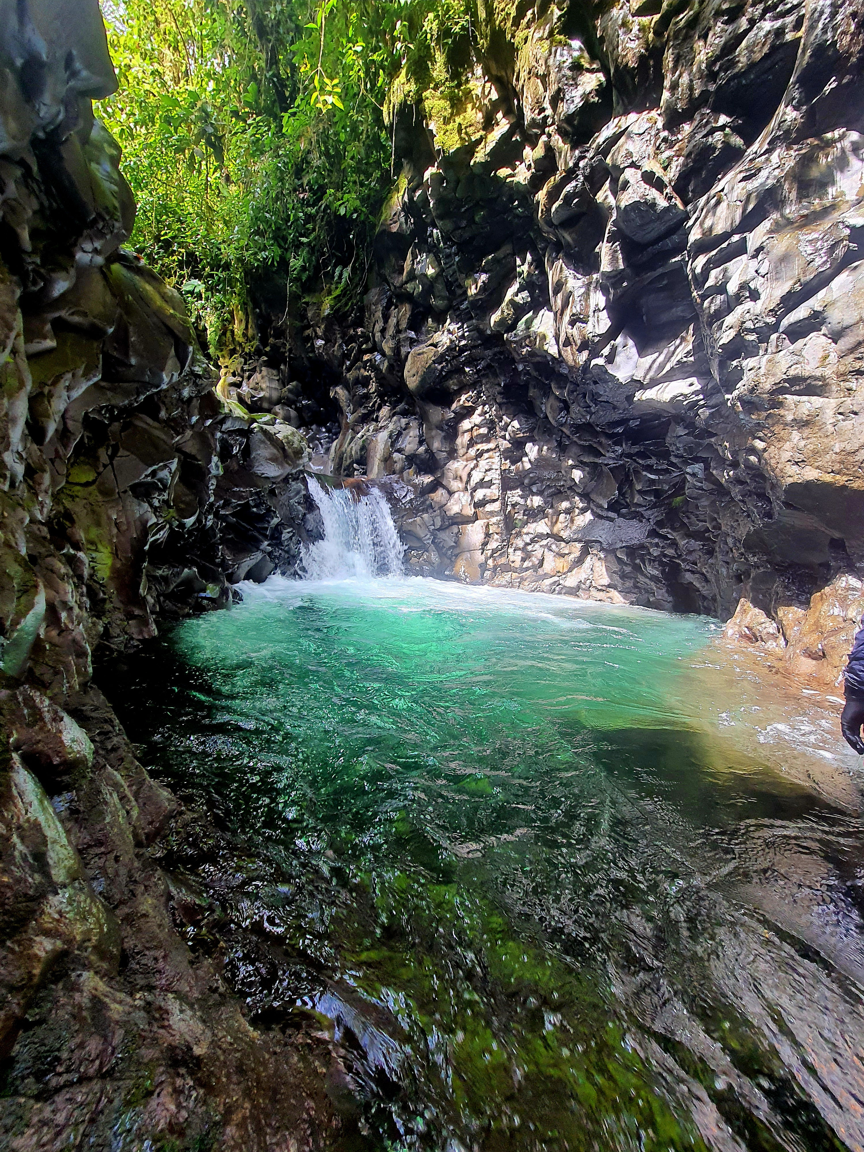 Nos adentramos en el cañón y realizamos los 5 descensos y rapeles, incluyendo saltos y un divertido tobogán natural, atravesando paisajes espectaculares y piscinas de aguas cristalinas.